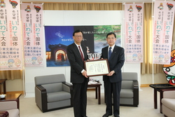 株式会社東北銀行様から、2016年の国体PR用のウエットティッシュ2,500個とのぼり200枚をご協賛いただき、11月4日(木)、取締役頭取 村上 尚登 様から上田市長に、寄贈いただきました。