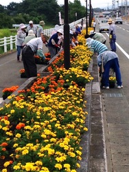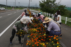 8月26日(金)に、花のリレー事業ということで、花巻市総合体育館へ向かう道路脇の花壇に花植えを行い、2,000株のマリーゴールドを、新田自治会の皆様に植えていただきました。